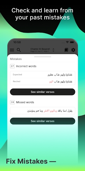 - وضع الحفظ والتسميع 📌 وهي الميزة الأقوى؛ حيث يمكنك إخفاء الآيات والبدء بالتسميع من ذاكرتك. إذا أخطأت في كلمة، أو نسيت آية، أو استبدلت كلمة بأخرى، سيتوقف التطبيق وينبهك للخطأ من خلال إظهار الكلمة الصحيحة باللون الأحمر.